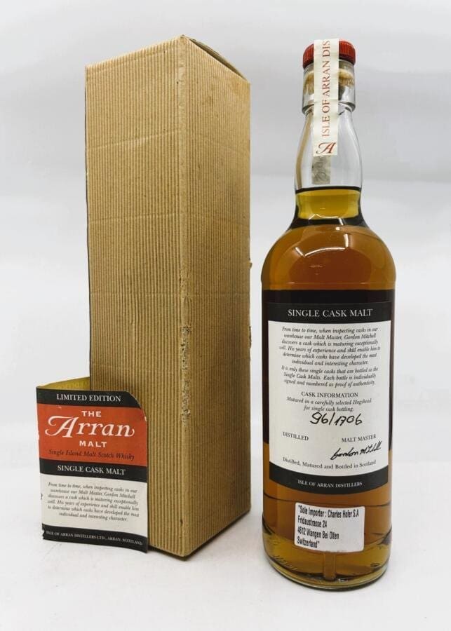Aus den Anfängen der Destillerie (Produktionsstart 1995). Zu Beginn wurden durch den damaligen Generalimporteur in der Schweiz viele gefüllte Whiskyfässer in die Schweiz importiert (das war damals noch problemlos möglich). Eine damals sehr wichtige Unterstützung der jungen Destillerie Arran. Viele der Fässer standen in den Filialen von Globus, wo Kunden sich dann selbst ein Fläschchen abfüllen konnten. Eine Vorreiterrolle, für das, was heute in bald jeder schottischen Destillerie möglich ist. Jedenfalls dürfte es sich bei dieser Flasche um so eine Abfüllung handeln.