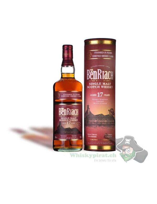 Beim BenRiach 17 Jahre (PX – Sherry Finish) handelt es sich um einen 17-jährigen Single Malt Whisky aus der Speyside. Er reifte in ehemaligen Bourbon Fässern, wobei er die letzten 1-2 Jahre in ausgewählten Pedro Ximenex Sherry Fässern verbrachte. Die Abfüllung erfolgte im Juli 2016 nicht kühlgefiltert und nicht eingefärbt. Über die Anzahl Flaschen kann nur spekuliert werden und liegt wohl irgendwo zwischen 3’000 bis 5’000 Stück.