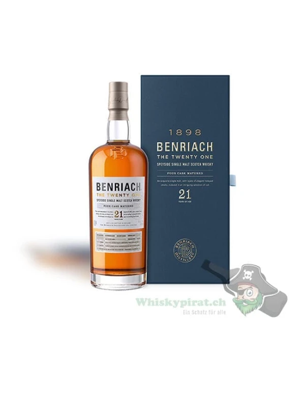Beim BenRiach (21 Jahre) – The Twenty One handelt es sich um einen elegant rauchigen Speyside Single Malt Whisky welcher im Jahr 2020 neu auferlegt wurde. Er lagerte in seinen 21 Jahren in einer Kombination aus Bourbonfässern, Sherryfässern, frischen Eichenfässern und Bordeaux Rotweinfässern. Die Abfüllung erfolgte nicht eingefärbt und nicht kühlgefiltert.