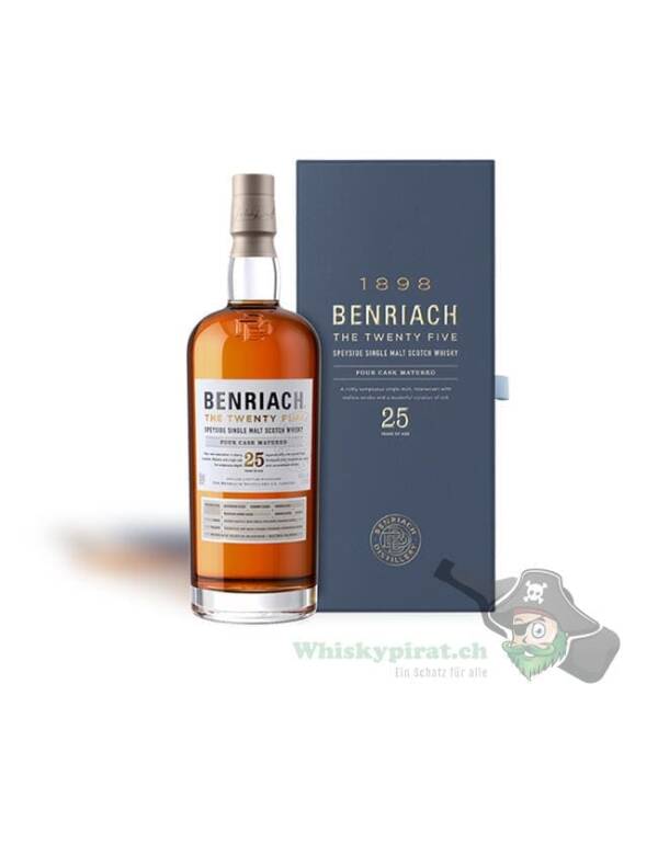 Beim BenRiach (25 Jahre) – The Twenty Five handelt es sich um einen mild rauchigen Speyside Single Malt Whisky welcher im Jahr 2020 neu auferlegt wurde. Er lagerte in seinen 25 Jahren in einer Kombination aus Bourbonfässern, Sherryfässern, frischen Eichenfässern und Madeirafässern. Die Abfüllung erfolgte nicht eingefärbt und nicht kühlgefiltert.