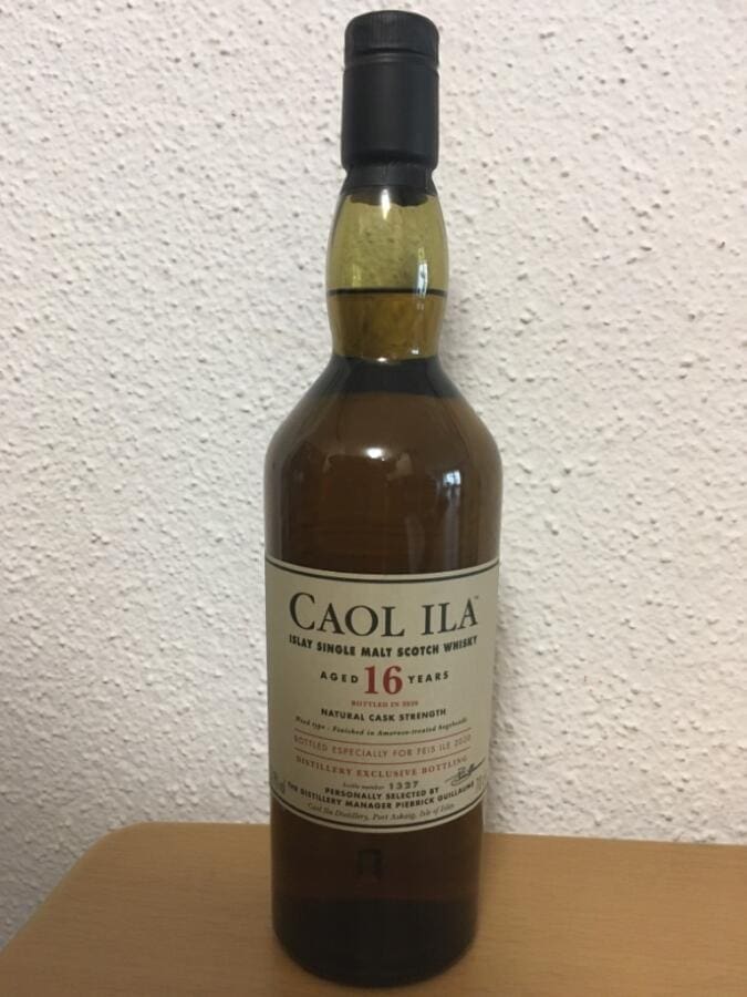 Der Caol Ila (16 Jahre) Feis Ile 2020 lagerte für 16 Jahre und erhielt eine Nachreifung in Amoroso-treated Hogsheads. Abfüllung erfolgte in Fassstärke, nicht kühlgefiltert und nicht eingefärbt mit einer Stückzahl von 3’000 Flaschen.