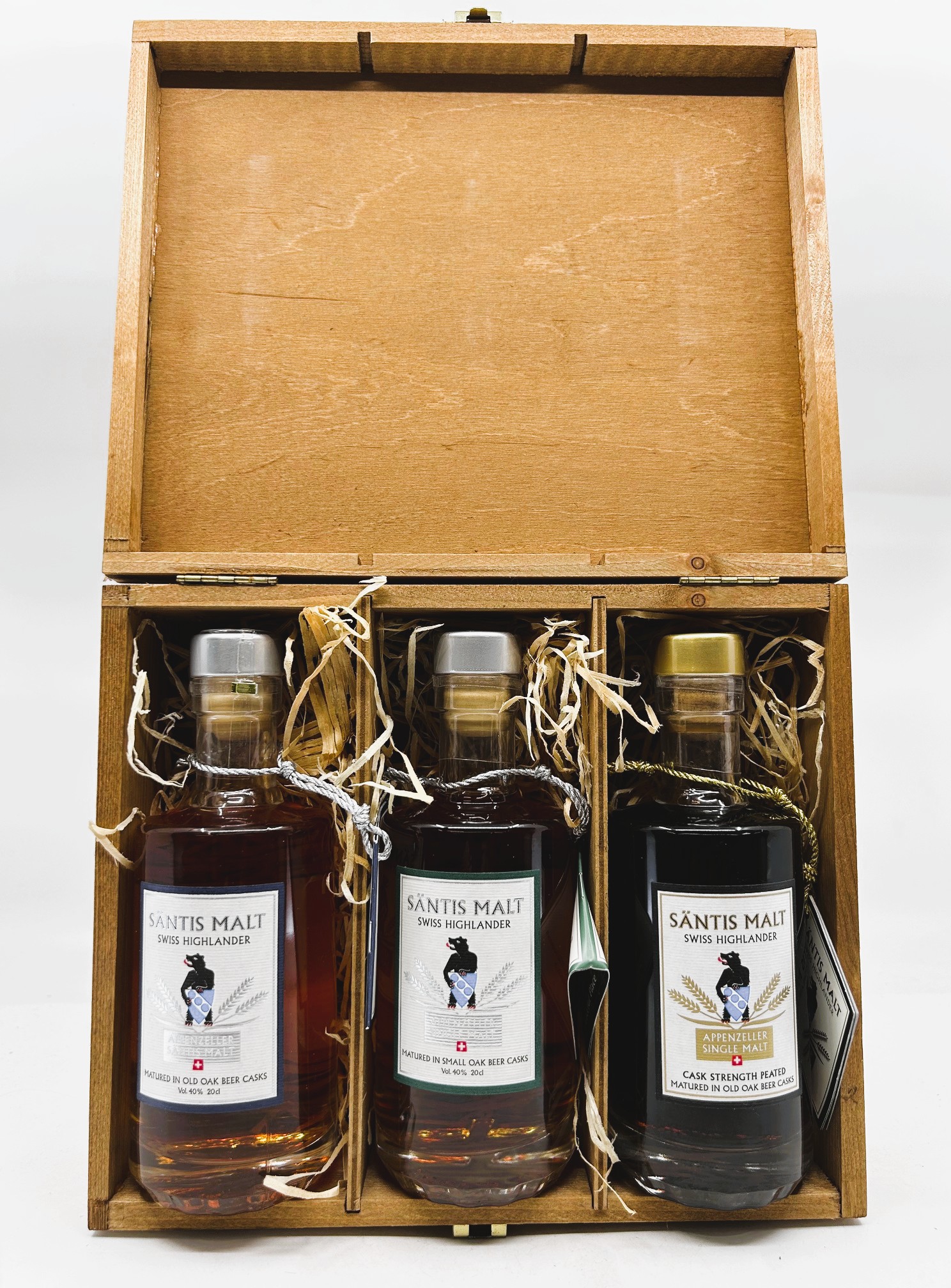 Die damalige Standardserie von Säntis Malt. Der Blaue, der Grüne und der rauchige Schwarze (der damals mit Lob und Auszeichnungen überhäuft wurde). Allesamt noch mit der alten Angabe Swiss Highlander, die heute nicht mehr verwendet werden darf. Sowohl die blaue Edition wie auch die schwarze Edition (Peated Whisky) werden nicht mehr produziert.