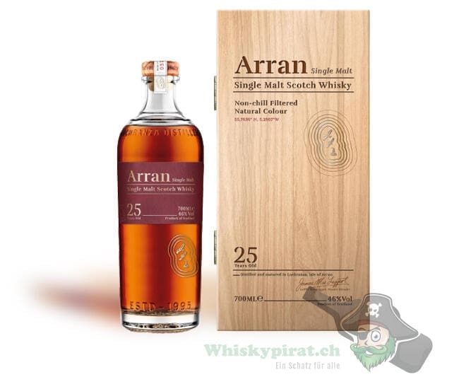 Beim Arran (25 Jahre) handelt es sich um eine Neuauflage die 2020 erstmalig herausgegeben wurde. Er lagerte in seinen 25 Jahren in Bourbon- und Sherryfässern von 1995 und erhielt eine Nachreifung in Sherry Hogsheads. Die Abfüllung erfolgte nicht kühlgefiltert und nicht eingefärbt mit einer limitierten Stückzahl auf 3’000 Flaschen.