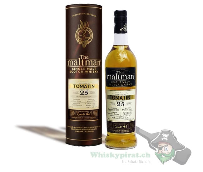 Beim The Maltman Tomatin (25 Jahre – 1993) handelt es sich um einen Single Malt Whisky aus der Tomatin Destillerie. Dieser wurde im November 1993 destilliert und lagerte in seinen 25 Jahren in einem ehemaligen Sherry Fass mit Nachreifung in einem Moscatel Süssweinfass. Die Abfüllung im März 2019 erfolgte für ‚The House of Single Malts‘ zum 15-jährigen Jubiläum. Nicht kühlfiltriert und nicht eingefärbt in Fassstärke, limitiert auf 262 Flaschen.